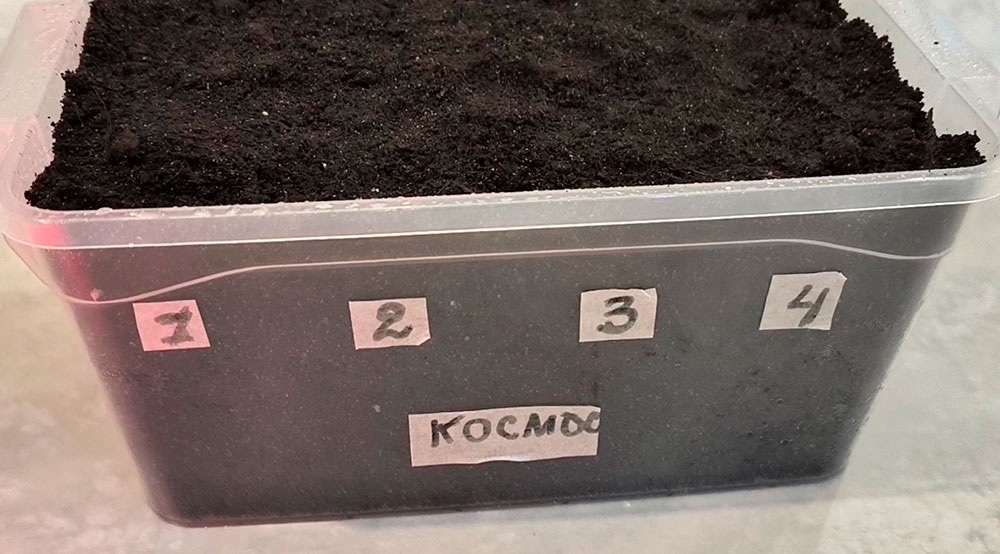 Всего у нас четыре семечка из космоса. Для сравнения взяли также четыре семечка обычных "земных" семян, то есть тех, которые в космос не летали. Это так называемая контрольная группа, чтобы в сравнении было сразу понятно, есть ли особенности у "космических" семян.