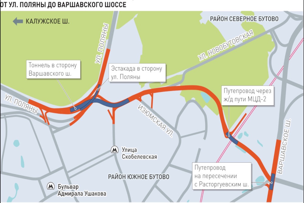 Этот финальный участок, сооружение которого началось в 2023 году, длиной по прямой - более 3,5 километра, но при его сооружении будет построено и реконструировано 14 километров дорог. По словам главы столицы, участок очень сложный. В его состав входят четыре искусственных сооружения, среди которых самый трудный - путепровод через второй Московский центральный диаметр. "Сложностей добавляло то, что надвижка пролетного сооружения велась только по ночам, в технологические окна, чтобы не прерывать движение поездов", - рассказал Собянин. Еще по одному путепроводу - длиной 900 метров будет построен по основному ходу Варшавского шоссе в районе пересечения с магистралью с тремя полосами движения, транспорт уже пошел в декабре 2025 года. На очереди сооружение эстакады - съезда с основного хода магистрали на улицу Поляны в сторону МКАД. Кроме того, по основному ходу магистрали через улицу Поляны будет построен тоннель с двумя полосами движения в каждую сторону. В рамках проекта также предусмотрены девять подземных и надземных переходов.