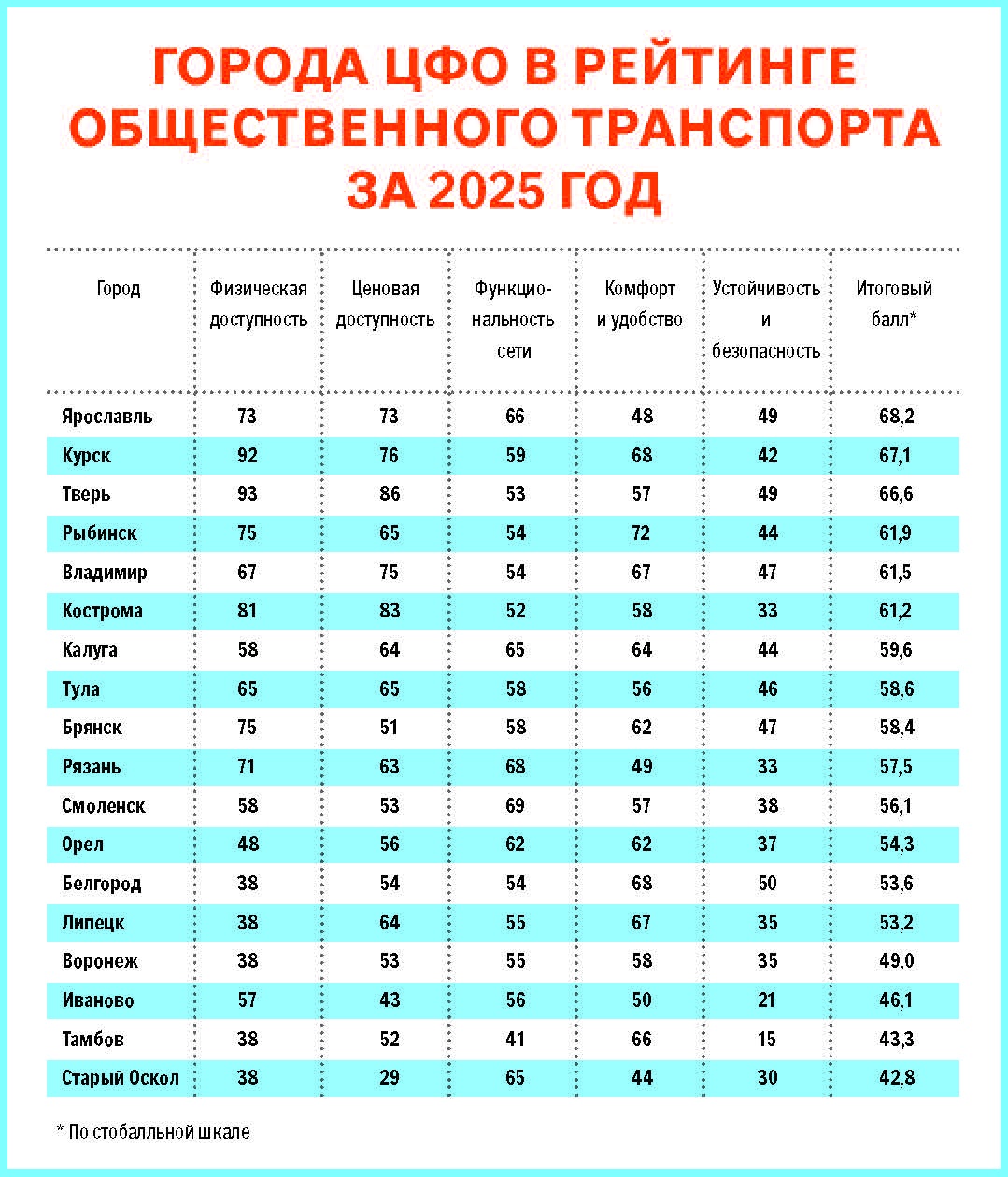 В число аутсайдеров среди областных центров ЦФО вошли Воронеж (49 баллов), Иваново (46,1) и Тамбов (43), занявшие 77-е, 81-е и 84-е места соответственно. В последнем городе ситуация с возрастом и состоянием транспорта, по мнению исследователей, "зашла в абсолютный тупик". В сравнении с предыдущим рейтингом Тамбов наряду с Липецком опустился на 12 пунктов.