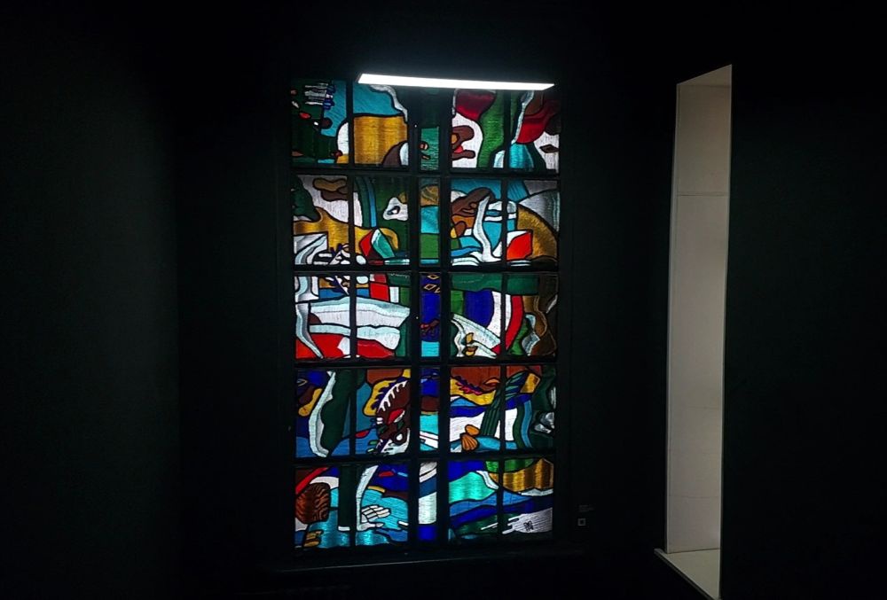Внутри - метлахская плитка, кирпичные стены и старинные лестницы бывшего доходного дома. А между вторым и третьим этажами посетители музея видят витражное окно (витраж "Амур", Хабаровск, автор - Вовкин Н.М., VI зональная выставка "Советский Дальний Восток").