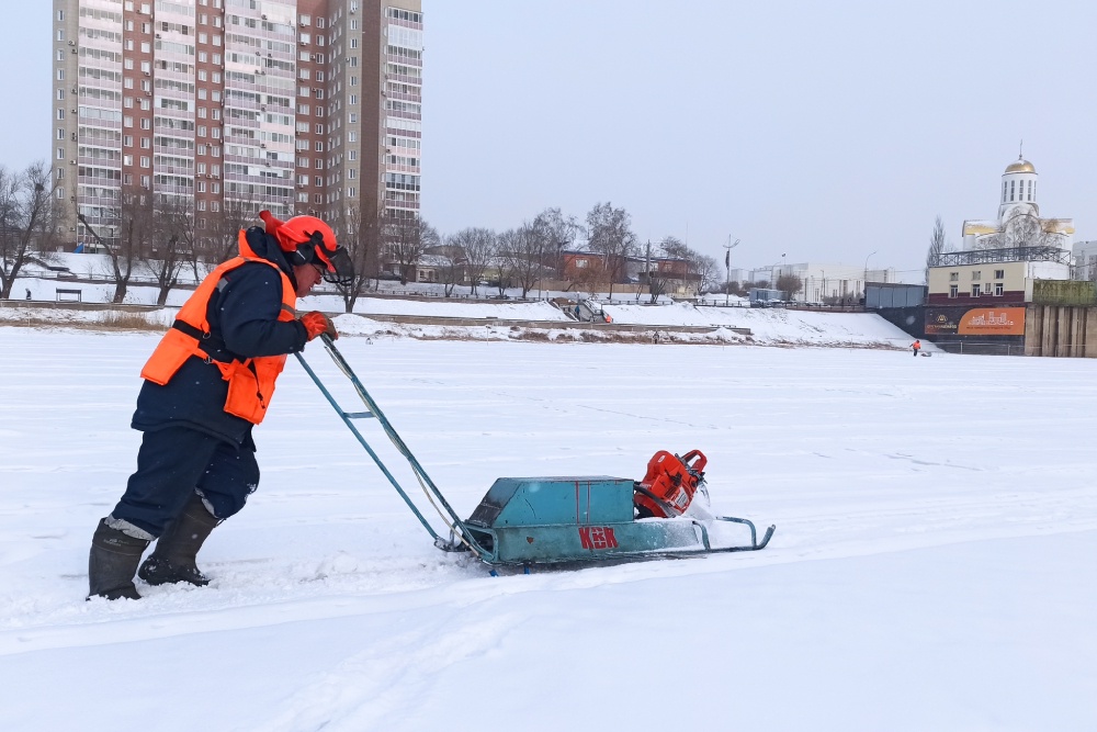 Лед пилили на расстоянии 100 метров от гидросооружений. Его просто разрезали на прямоугольники размером 6 х 9 метров. После вскрытия реки эти геометрические фигуры пройдут через сооружения не общей массой, а частями, что позволит избежать образование заторов и защитить мосты.