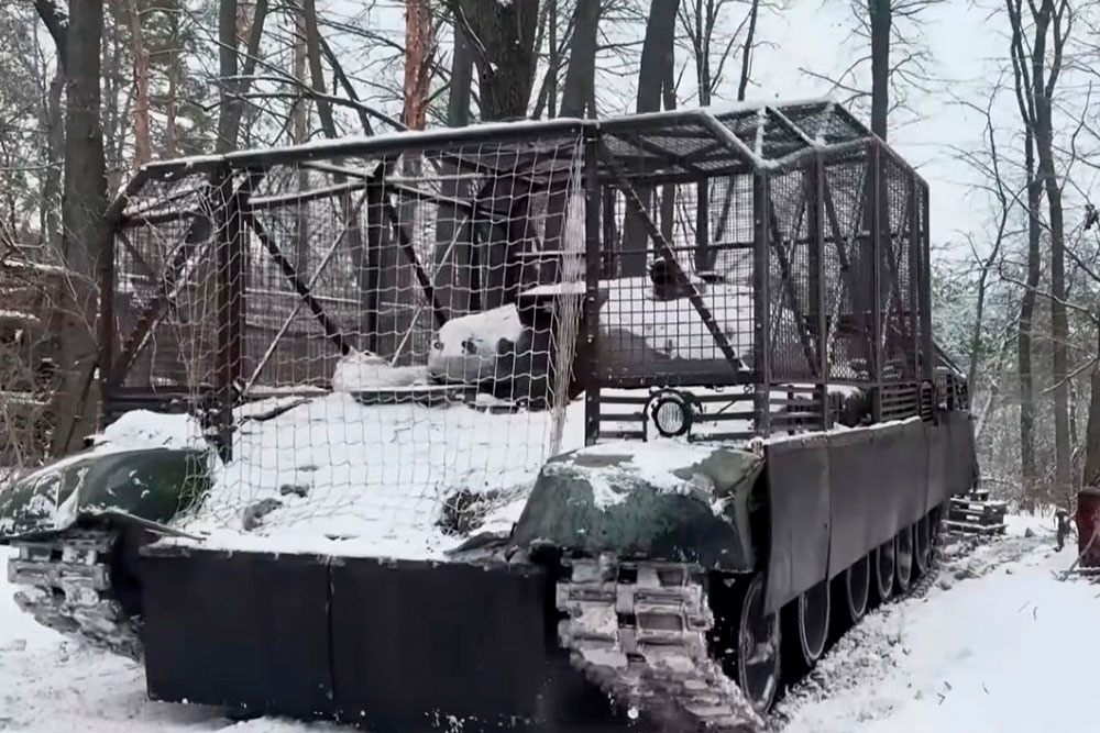 Защита от дронов обеспечивается наличием массивного "мангала" с решетками и сетями. Крыша моторно-трансмиссионного отделения также прикрыта. По всей видимости, эта машина не имеет какого-либо вооружения.