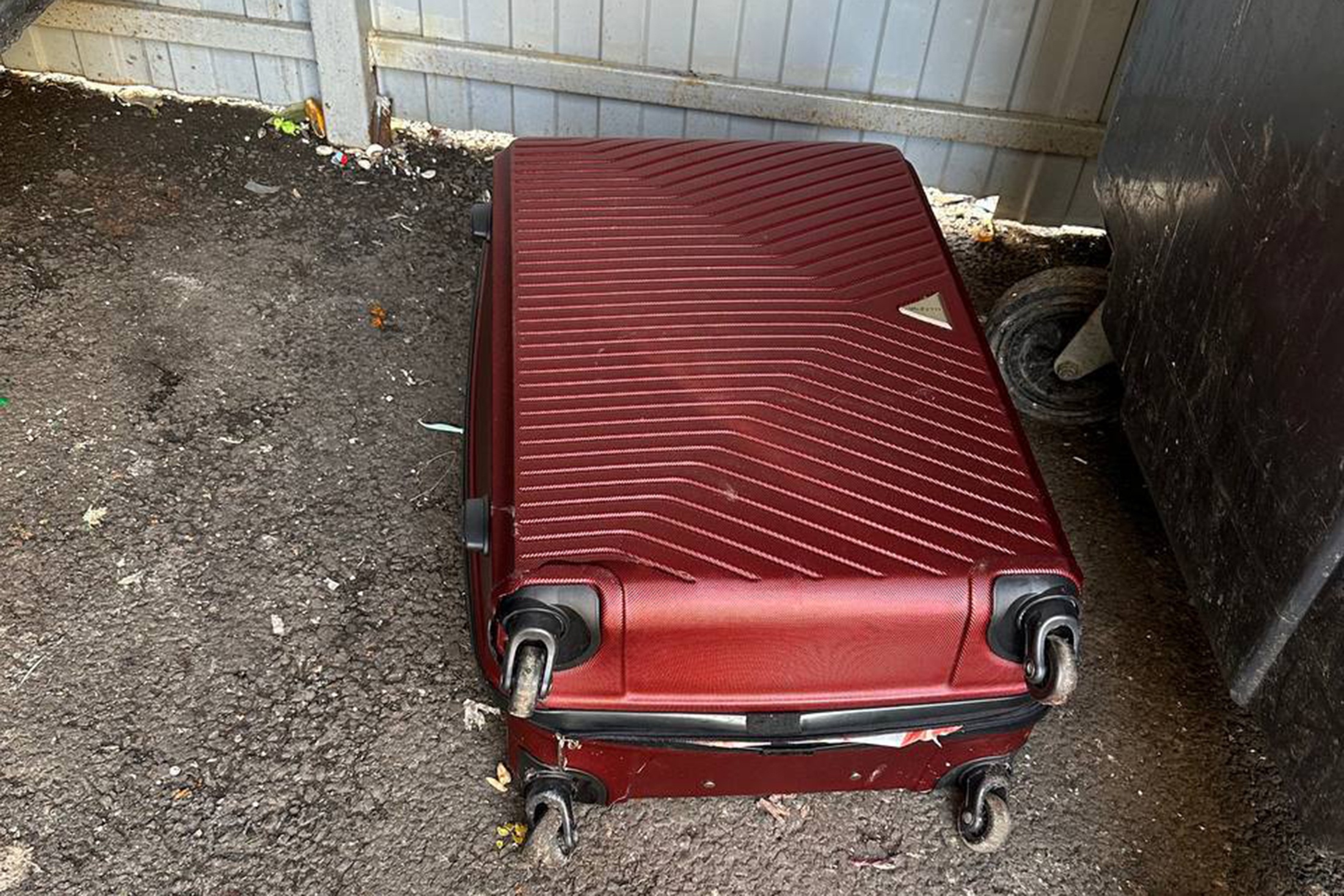 На фотографии виден чемодан на колесиках темно-красного цвета. Он лежит плашмя, предположительно, на площадке для сбора бытовых отходов. Сквозь нижнюю часть молнии виден фрагмент некой ткани или полиэтилена, находящийся в чемодане.