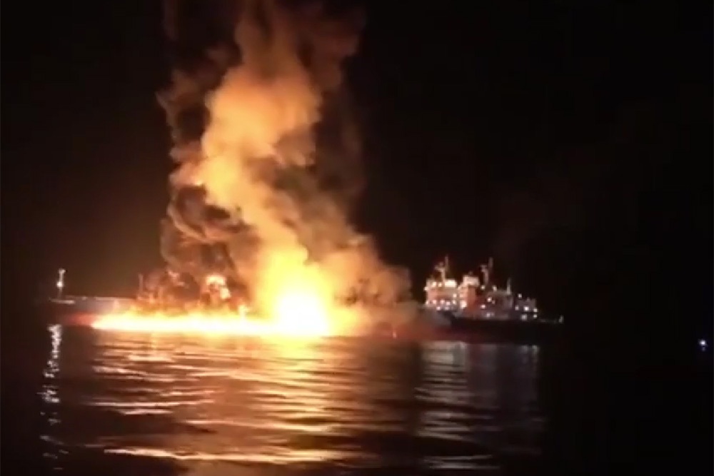 На кадрах можно увидеть горящий корабль, вероятно, контейнеровоз, и как минимум пять катеров. Масштаб съемки не позволяет определить, являются ли они безэкипажными или классическими маломерными судами.