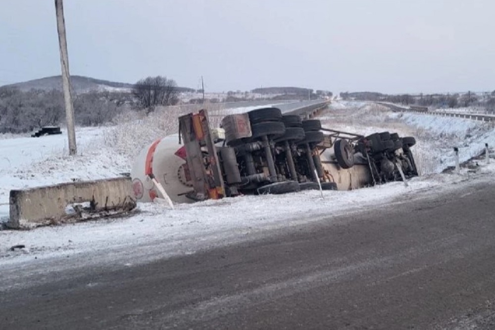 На месте происшествия работают экипажи ДПС. Полицейские обеспечивают охрану места инцидента и осуществляют регулирование движения. По предварительной информации, пострадавших и утечки газа нет.
