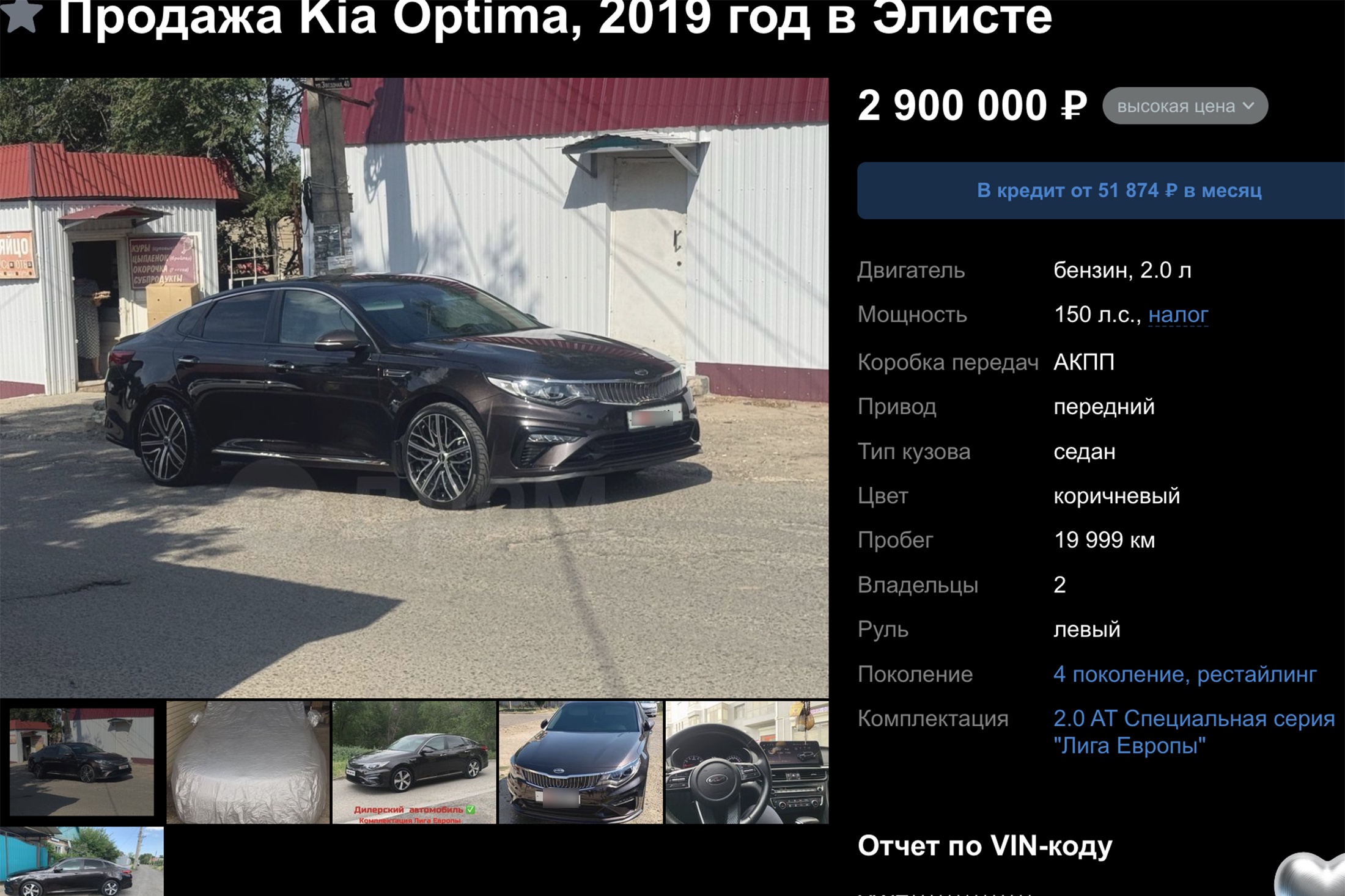 Как выяснила "Российская газета", в Элисте выставили на продажу Kia Optima 2019 года выпуска с пробегом чуть меньше 20 тысяч км. Владелец просит за свой автомобиль весьма солидную сумму - 2,9 млн рублей.