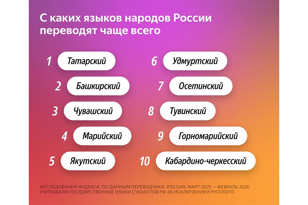 Результаты исследования показали, что пользователи переводят тексты как с иностранных языков, так и с языков народов России. В 2023 году был запущен проект по их сохранению. Сейчас доступно 18 языков народов России, в том числе малочисленных - например, мансийский, абазинский и ногайский. Чаще всего пользователи переводят с татарского, башкирского, чувашского, марийского и якутского языков.