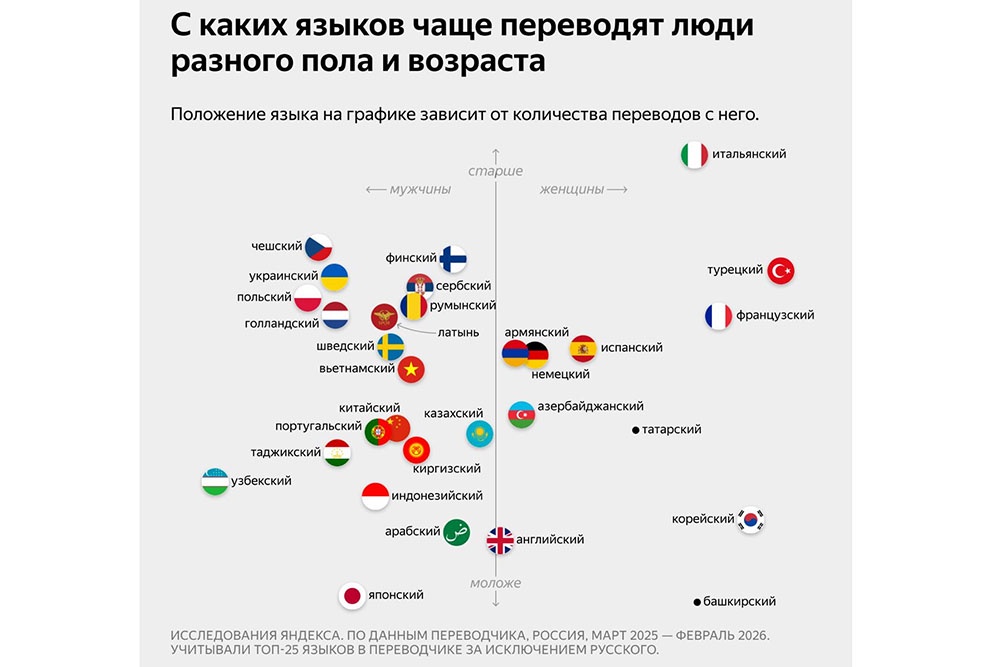 Отдельно отмечено, что языковые предпочтения мужчин и женщин различаются. Женщины на 70% чаще мужчин переводят тексты с турецкого языка. У женской аудитории на 63% выше интерес к корейскому языку и на 55% - к французскому. По мнению экспертов, это может быть связано с популярностью зарубежных сериалов и литературы, а также с высоким интересом к корейской поп‑культуре и косметике. Мужчины заметно активнее переводят с узбекского языка (их доля переводов в 3,2 раза больше), а также с китайского, польского и японского. Это может объясняться деловыми контактами, рабочей миграцией и профессиональными интересами.