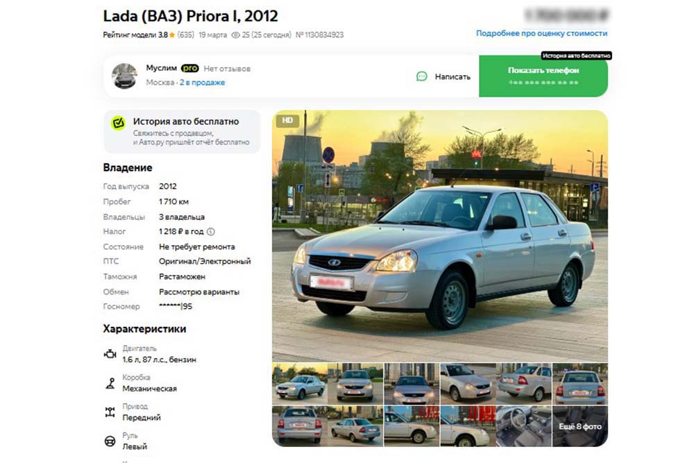 Как выяснила "Российская газета", в РФ выставили на продажу Lada Priora, которая с 2012 года проехала всего 1710 км. За свою "капсулу времени" владелец просит весьма солидную сумму - 1,7 млн рублей.