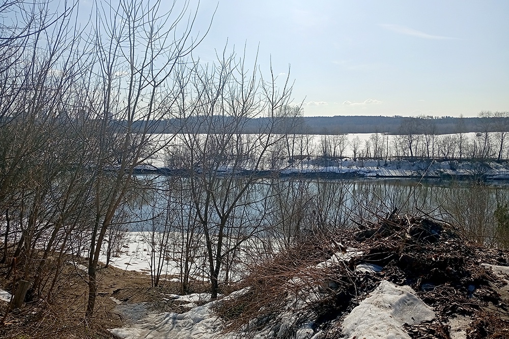 Пройти тут сейчас в обычной демисезонной обуви тяжело - грязь кругом, разве что резиновые сапоги помогут. Но в первые дни марта дороги были под снегом. Ребята спокойно спустились по насту к реке. Сейчас она почти полностью оттаяла, а тогда, по свидетельству опрошенных нами местных жителей, была покрыта примерно 10-сантиметровым снежным слоем.