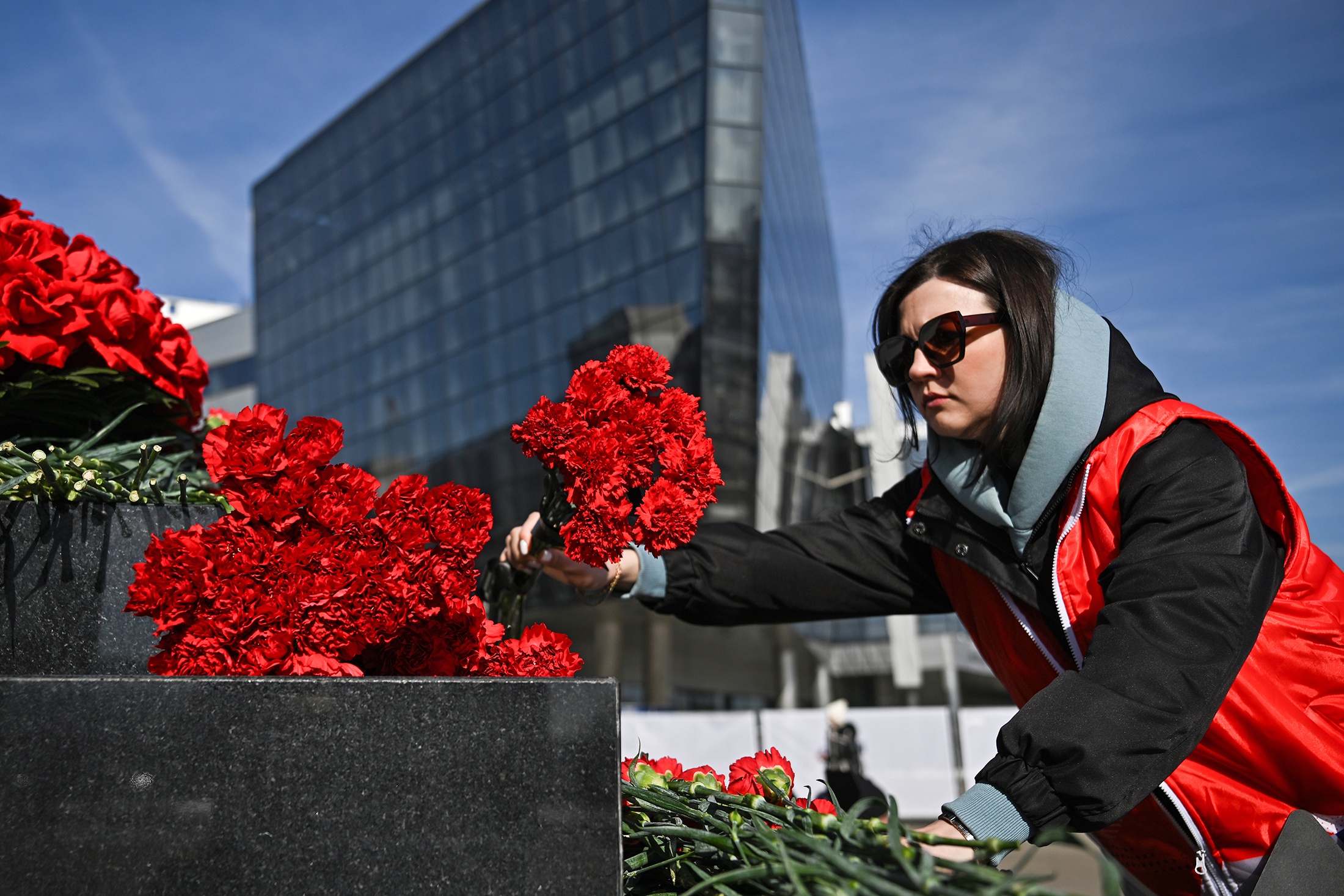 Среди пришедших участники движения "Общероссийский народный фронт" и добровольцы Всероссийского студенческого корпуса спасателей. При входе на территорию "Крокус Сити Холла" установлены металлодетекторы, а волонтеры из Подмосковья следят за порядком у мемориала.