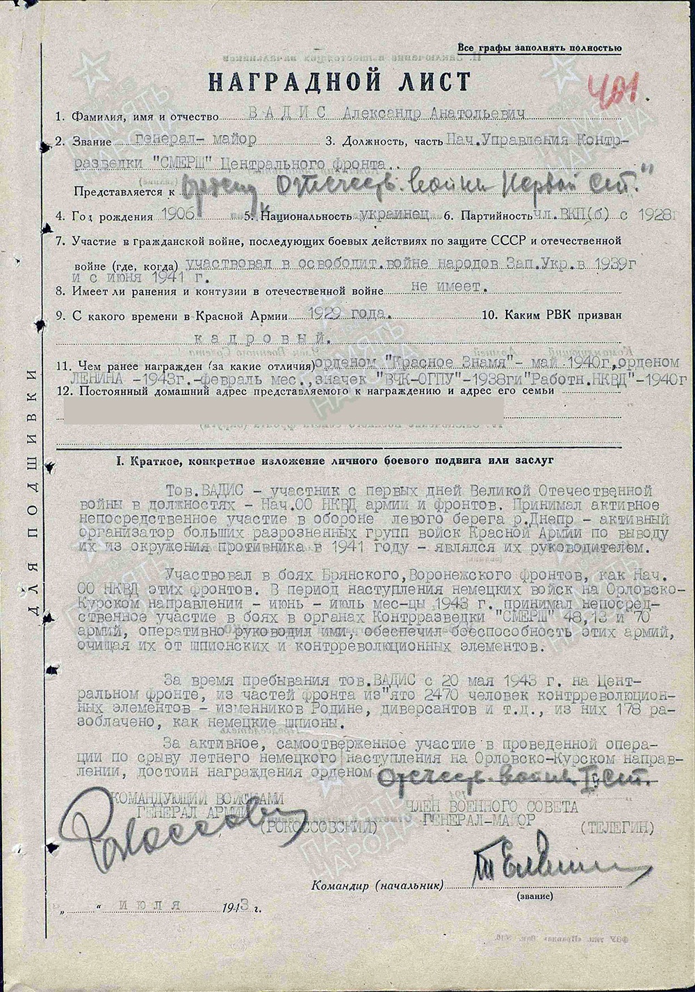 Из представления на генерал-майора Вадиса А.А. к ордену Отечественной войны I степени, подписанного командующим Центральным фронтом генералом армии Рокоссовским К.К. (июль 1943 г.):