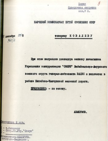 Так, 31 декабря 1945 года начальник ГУКР "Смерш" НКО СССР генерал-полковник Абакумов В.С. направил сопроводительное письмо наркому путей сообщения СССР И.В. Ковалеву и докладную записку начальника УКР "Смерш" Забайкальско-Амурского военного округа генерал-лейтенанта Вадиса А.А. о недочетах в работе Китайско-Чанчуньской железной дороги от 23 декабря 1945 года.