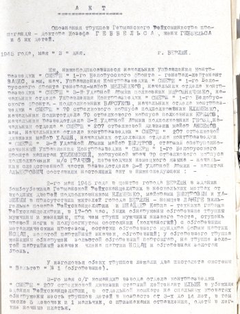 " 2-го мая 1945 года в городе Берлине на территории Имперской канцелярии рейхстага на Вильгельмштрассе, где в последнее время была ставка Гитлера, обнаружены обгоревшие трупы, в которых опознаны имперский министр пропаганды Германии доктор Геббельс и его жена…