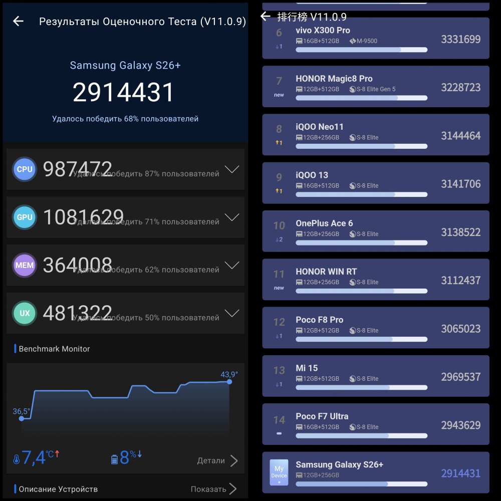 Да, в тестах типа AnTuTu Exynos 2600 уступает Snapdragon 8 Elite Gen 5, но 2,9 млн баллов, которые он набирает, с запасом хватит на любые самые тяжелые игры, не говоря уже о других задачах. Что касается длительной нагрузки, нагрева и троттлинга, здесь вообще все очень хорошо. Все наши тесты, даже часовые, показали устойчивую работу и отсутствие перегрева, а также умеренный троттлинг.