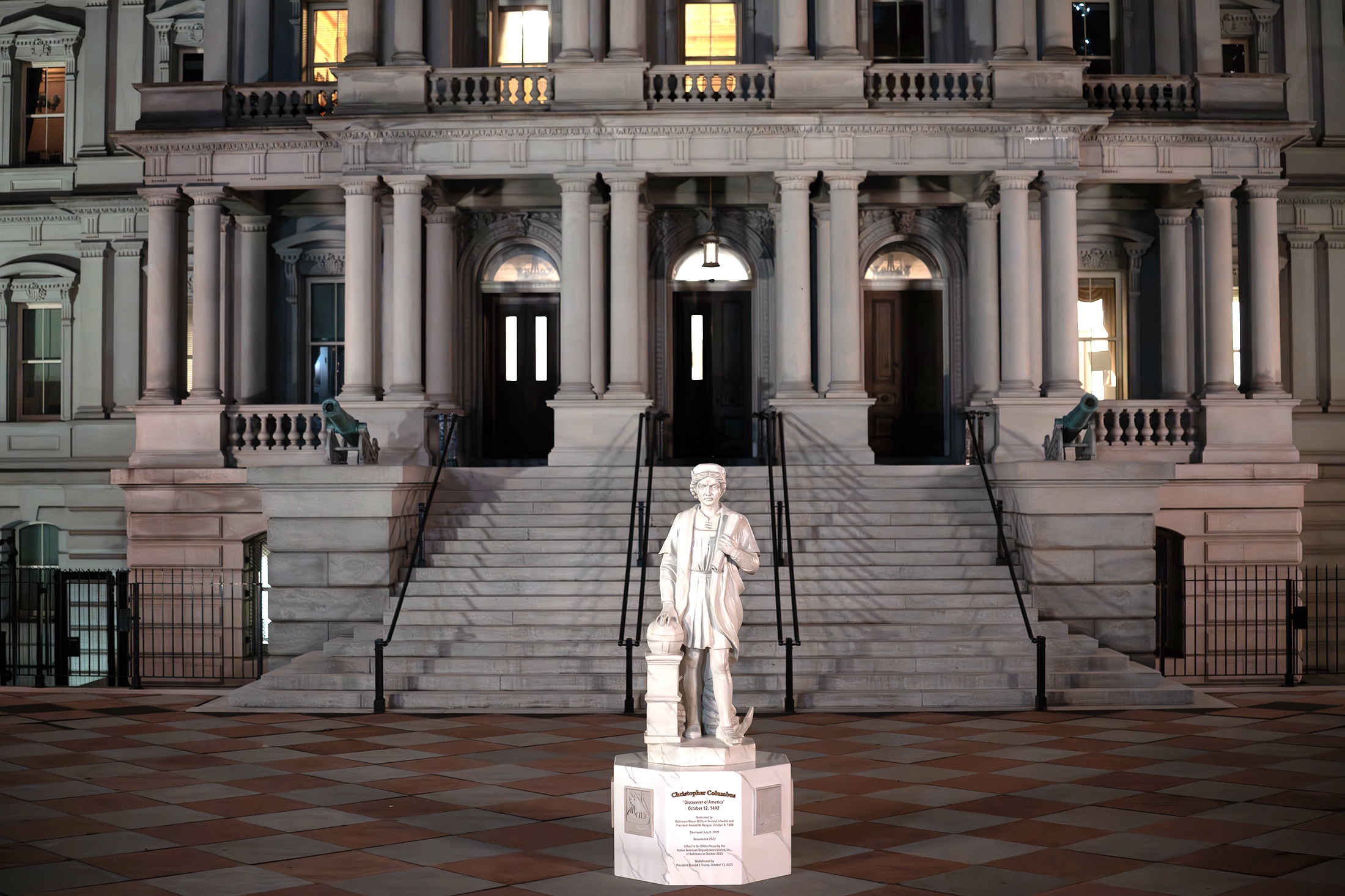 Установленный монумент - копия того, что был сброшен в гавань Балтимора в 2020 году во время массовых акций протеста против расизма, спровоцированных убийством полицейскими афроамериканца Джорджа Флойда. Манифестанты утверждали, что итальянский мореплаватель несет ответственность за геноцид и эксплуатацию коренных народов Америки. Трамп, в свою очередь, осудил произошедшее, назвал инцидент "нападением на нашу коллективную национальную память" и создал целевую группу для восстановления памятников.