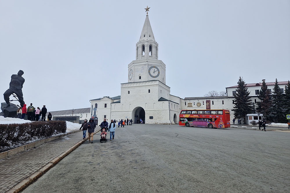 Сразу развею иллюзии, Иван Грозный осаждал не этот кремль - ханский был деревянным. Уже после взятия Казани царь повелел возвести здесь белокаменную крепость. Центральный вход - со стороны Спасской башни, слева от которой находится памятник татарскому поэту-герою Мусе Джалилю. Это самый узнаваемый, "открыточный" вид на кремль, визитная карточка Казани.