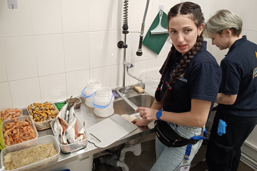 Стоило только зайти за кулисы больших и просторных аквариумов, как сразу возникло ощущение, будто попал на кухню ресторана. Повсюду - промаркированные ведра с заготовками, холодильники и морозильные камеры, наточенные ножи и разделочные доски. На стене - график кормления на неделю. Так, например, в понедельник кошачьи акулы и ленточная мурена лакомились кальмарами, во вторник актинии и ежи уплетали мидий и лангустинов, а в пятницу черноперую и белоперую акул угощали жирной рыбой.