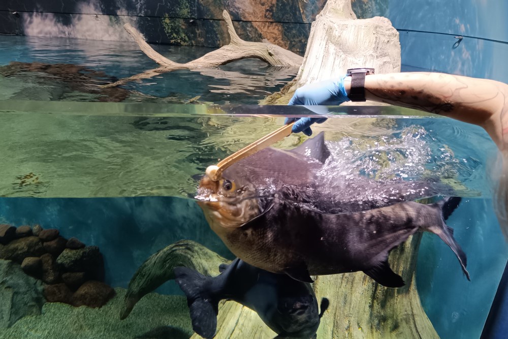 Особо вредных особей, которые не дают нормально поесть своим соседям, кормят индивидуально. В качестве примера рыбоводы привели растительноядных пираний паку, которые, словно пылесосы, затягивают в себя любой корм, попадающий в аквариум. Из-за этого им буквально закладывают еду в рот при помощи специального манипулятора.