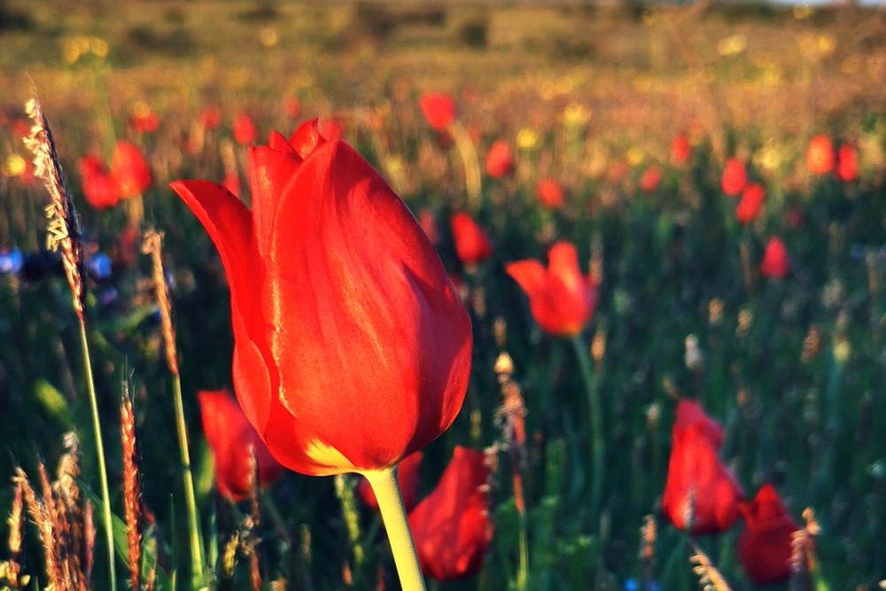 Самый крупный и яркий тюльпан Геснера (Шренка) (Tulipa gesneriana/schrenkii), который, кстати, считается символом Калмыкии, расцветает последним. У него чаще всего встречаются ярко-красные цветы, но в степи можно увидеть белые, желтые, розовые, оранжевые, бордовые и даже пестрые (двухцветные) экземпляры.