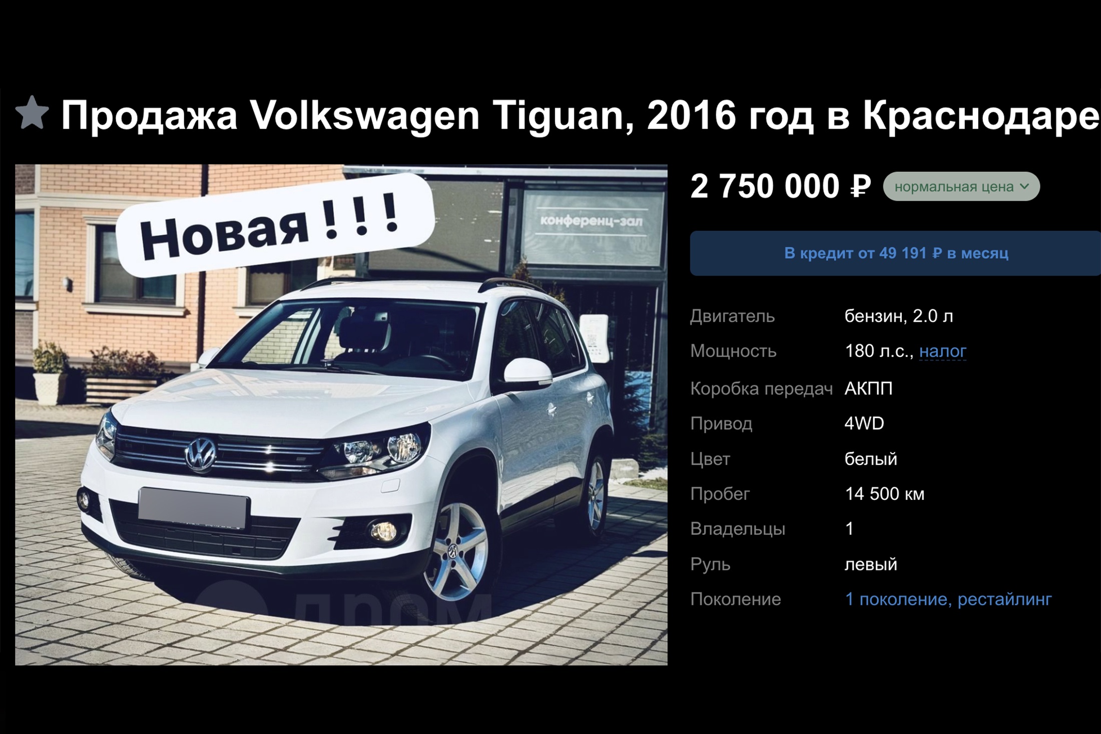 Как выяснила "Российская газета", в Краснодаре выставили на продажу Volkswagen Tiguan, который с 2016 года проехал всего 14 500 км. Владелец просит за свой автомобиль 2 570 000 рублей.