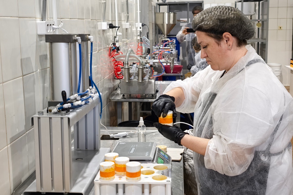 На производстве заняты и женщины, и мужчины. Одна из работниц выкладывает ярко-оранжевую массу в специальный пресс. На выходе получаются кружочки мангового скраба. Другая подставляет пластиковые флакончики, куда аппарат заливает косметический состав.