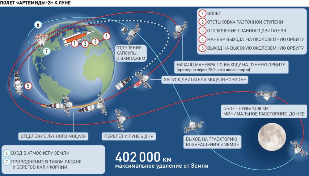 Orion в рамках миссии Artemis II полетел по примерно такой же схеме. Но сначала будет вытягивать свою околоземную орбиту, а не сразу начнет разгон до скорости, близкой ко второй космической. Астронавты должны облететь Луну, не высаживаясь на нее. Затем с помощью гравитационного маневра корабль вернется на Землю и приводнится в Тихом океане. Весь полет рассчитан на десять дней.
