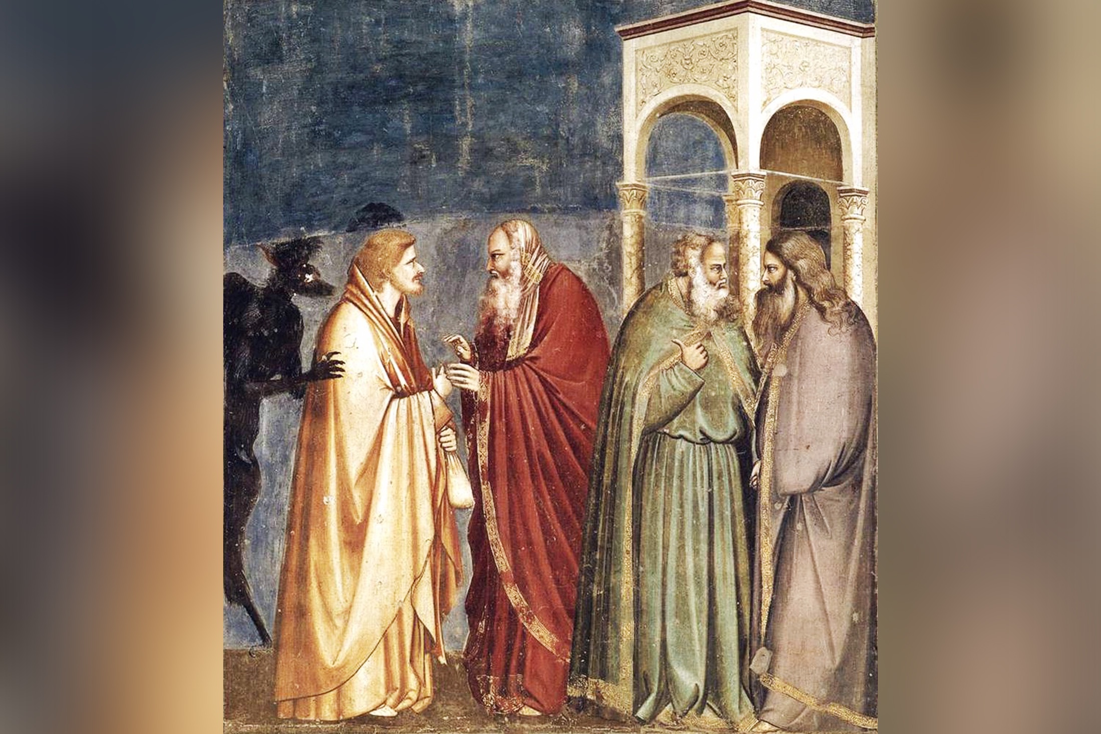 И дальше в Евангелии от Матфея стоит многозначительное слово "Тогда…". "Тогда один из двенадцати, называемый Иуда Искариот, пошел к первосвященникам, - читаем мы, - и сказал: что вы дадите мне, и я вам предам Его? Они предложили ему тридцать сребреников; и с того времени он искал удобного случая предать Его". Замечу в скобках: тридцать сребреников - цена раба в то время. Обратите внимание на черную фигуру рядом с Иудой на фреске Джотто.