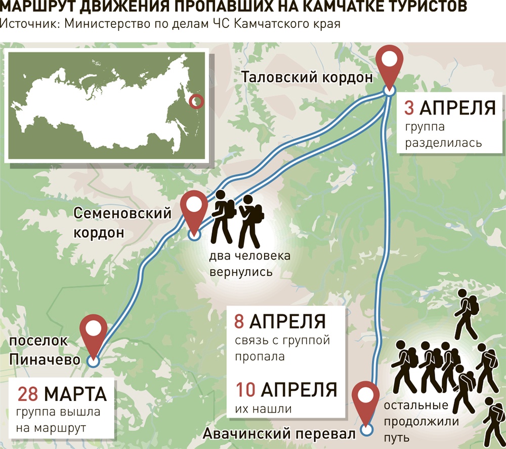 Еще 28 марта зарегистрированная группа из девяти человек отправилась из село Пиначево в поход по парку "Налычево". 3 апреля между туристами возникли разногласия - руководитель похода настаивала, что продолжать путь опасно из-за надвигающегося снегопада. К ней прислушался только один человек, а остальные продолжили идти к Авачинскому перевалу. 6 апреля эта семерка вышла на связь и сообщила, что все в порядке. Но затем на Камчатку пришла непогода, и туристы, не послушавшиеся руководителя, попали в беду. 8 апреля началась сильная пурга с низовой метелью и штормовым ветром.