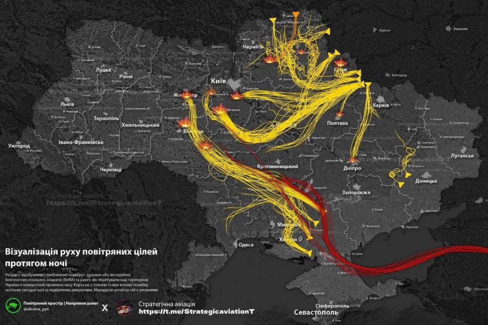 Ракеты вошли в воздушное пространство Украины с юго-востока, двумя группами. Большая эскадра Х-101 обошла по широкой дуге Николаев и направилась в Винницу, Житомир и на юг Киевской области. Туда же прилетели и остальные ракеты - но по более короткому пути, пройдя рядом с Николаевом.