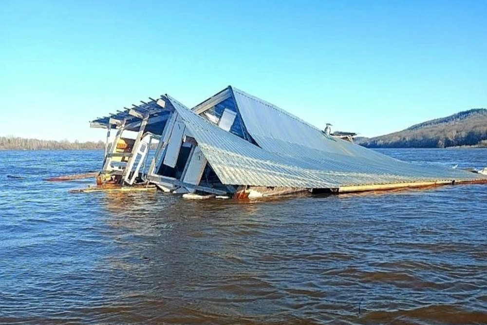 Деревянное строение немалой площади нашли сотрудники аварийно-спасательного отряда Нижегородской области в районе затона Бабинский. Судя по фото и видео - бревенчатое здание достаточно крепкое, оно деформировалось, но не развалилось на составляющие части при "спуске на воду". Здание плывет по течению, погрузившись почти по самую крышу в Оку. При этом запросов о помощи с обнаруженного объекта не поступало.