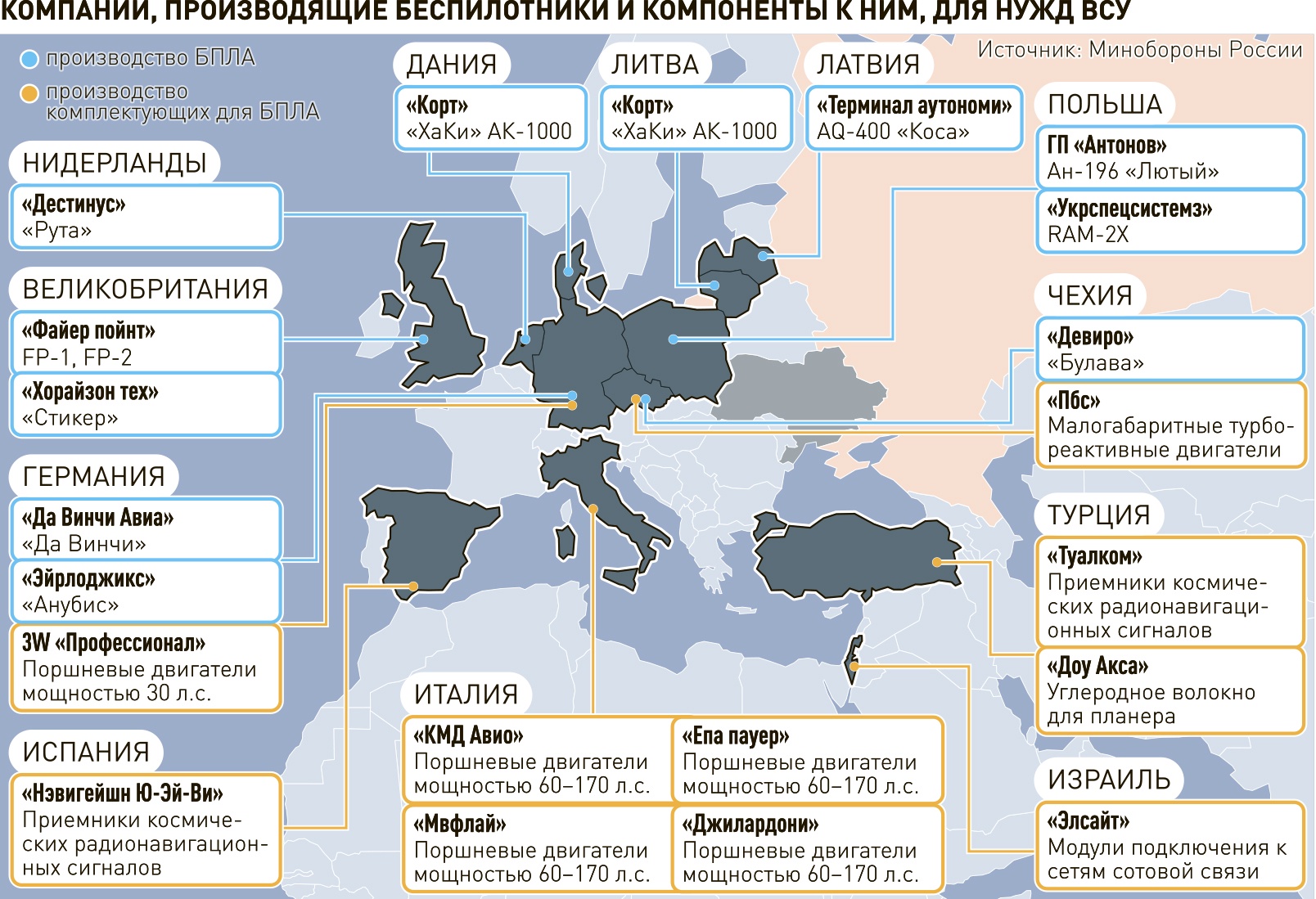 "Действия европейских правителей все быстрее втягивают эти страны в войну с Россией. Европейской общественности следует не только ясно понимать истинные причины угроз их безопасности, но и знать адреса, а также места расположения "украинских" и "совместных" предприятий по выпуску БПЛА и компонентов для Украины на территории своих стран", - заключили в Минобороны России.