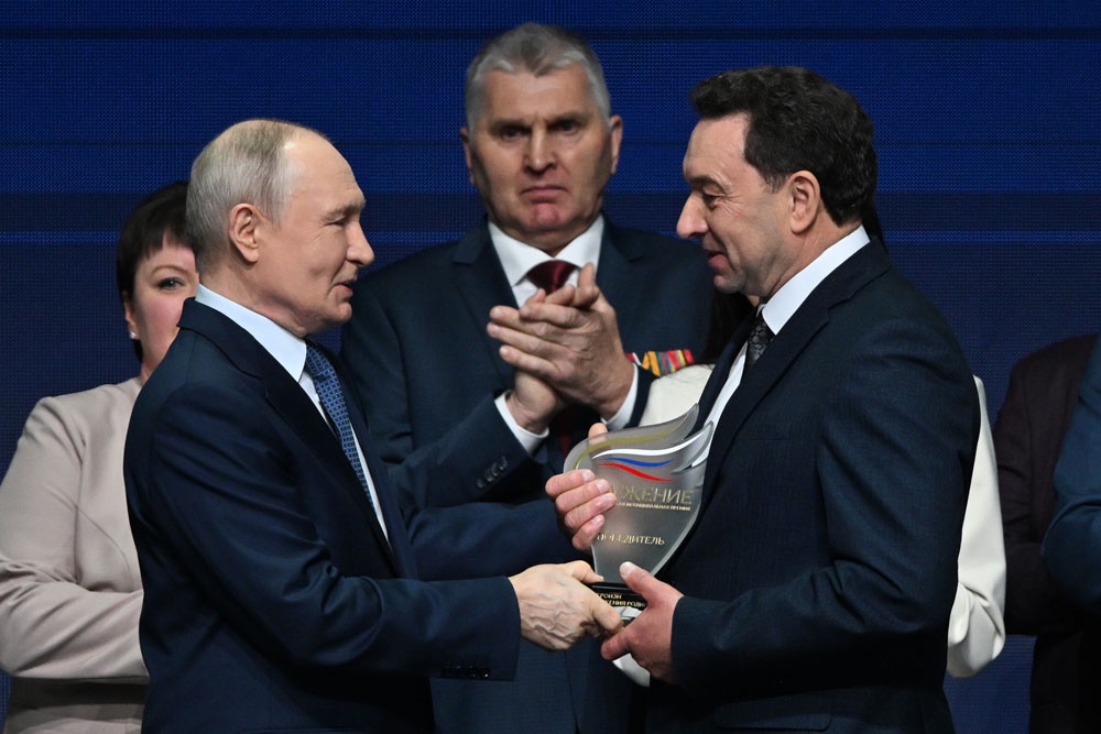 Президент РФ Владимир Путин на церемонии вручения всероссийской муниципальной премии "Служение" наградил директора Серпейской СОШ в Калужской области Евгения Филонова.
