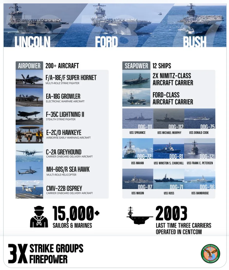 Сообщается, что в операции задействованы авианосцы "Авраам Линкольн", "Джеральд Форд" и "Джордж Буш", а также более 200 самолетов, 12 кораблей и около 15 тысяч матросов и морских пехотинцев ВМС США.
