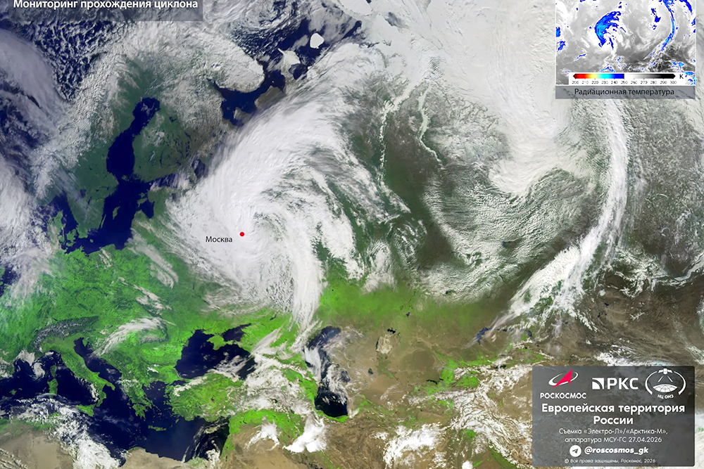 В понедельник российские метеоспутники передали на Землю космические снимки прохождения североатлантического циклона, который принес снег и обильные осадки в Москву. Об этом сообщает пресс-служба "Роскосмоса". В госкорпорации отметили, что этой ночью в столице выпало более половины месячной нормы осадков, а температура воздуха опустилась ниже нуля. Отмечается, что снимки были получены с гидрометеорологических аппаратов "Арктика-М" и "Электро-Л".