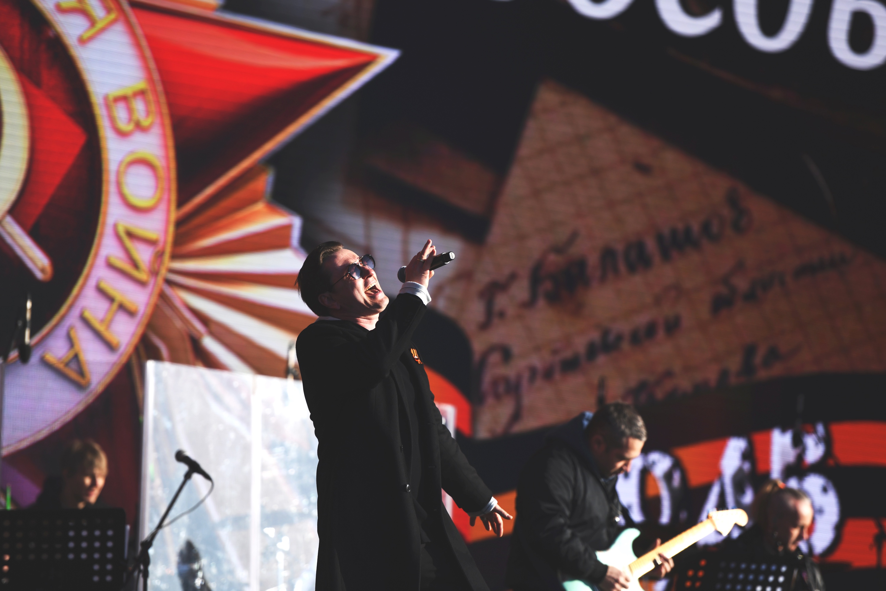 В 17:00 начнется отделение концерта, в котором будет участвовать художественный руководитель обоих театров, народный артист РФ Сергей Безруков. Он исполнит песни, посвященные Великой Отечественной войне, авторства Владимира Высоцкого и других поэтов. Вместе с ним на сцену выйдут артисты Московского Губернского театра, а также музыканты оркестра МГТ.