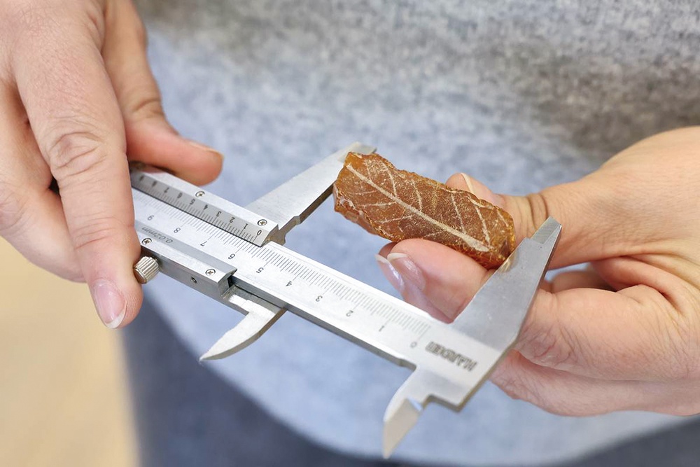 "Янтарный лист" размером 5,8 см на 2,1 см был обнаружен сотрудниками комбината во время сортировки.