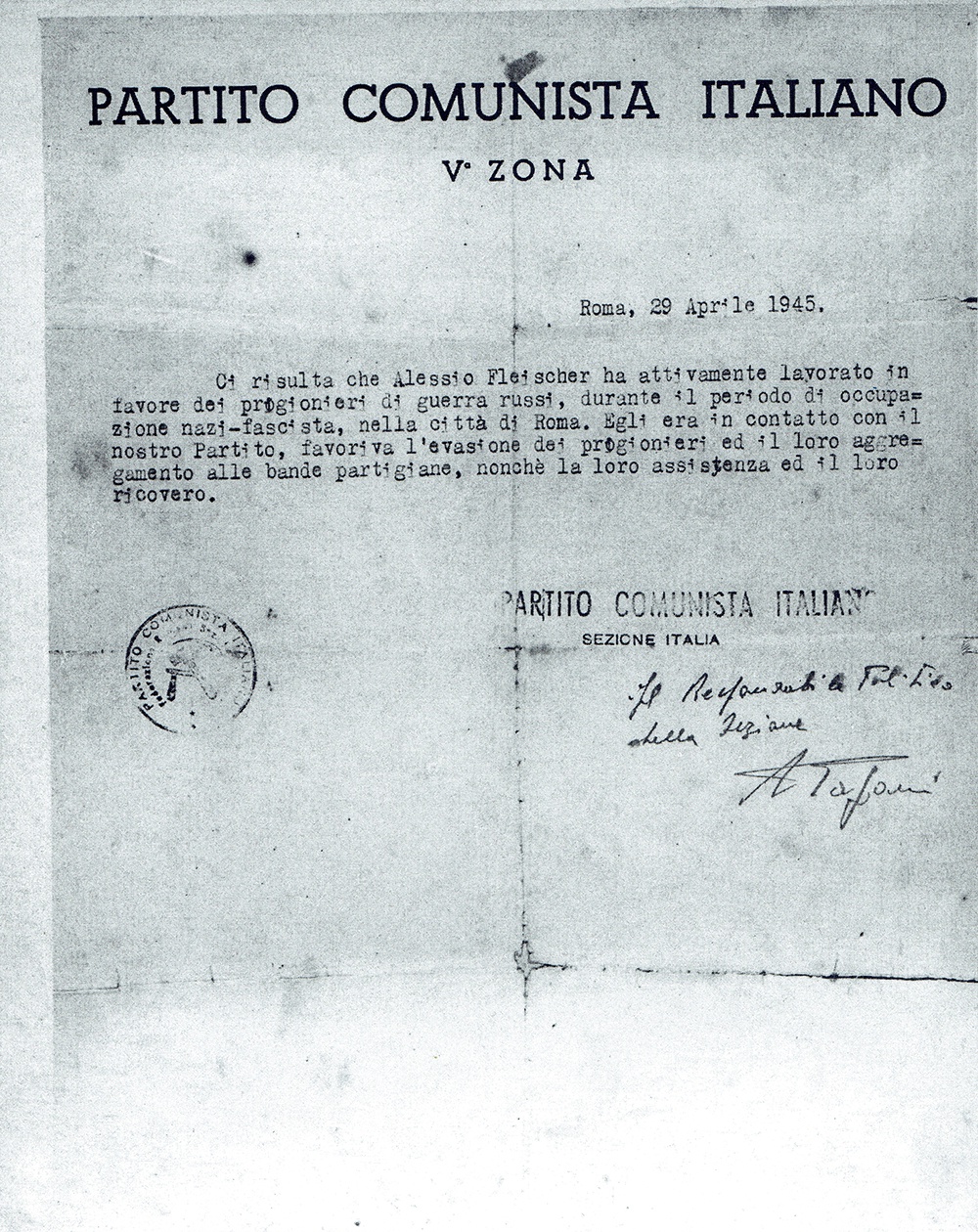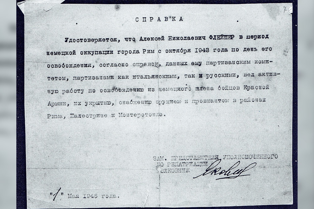 "Предпринял попытку бежать к албано-греческим партизанам и был переправлен в Италию. Осенью 1942 года переведен в Рим на положение поднадзорного, без права выезда, с регулярной явкой в полицию, но с правом частной работы. В октябре 1942 года Алексей Флейшер - уборщик и сервировщик в Сиамском посольстве. Организовал группу патриотов и начал подпольную работу в тесном контакте с итальянской компартией. Его группа помогала советским бойцам совершать побеги из немецкого плена, укрывала их, снабжая едой, одеждой, оружием. Их боевые партизанские группы действовали в окрестностях Рима. Первый побег советских пленных они организовали в местечке Монтеротонда, в лесах и горах которого расположился сам отряд. Среди бежавших были Алексей Коляскин и Анатолий Тарасенко, ставшие впоследствии во главе организованной группы партизан, состоявшей из бывших советских военнопленных. Они вели партизанскую войну в окрестностях Рима".