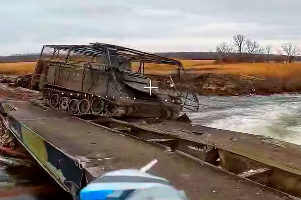 Удар дрона-камикадзе скинул с моста в реку БТР M113 ВСУ
