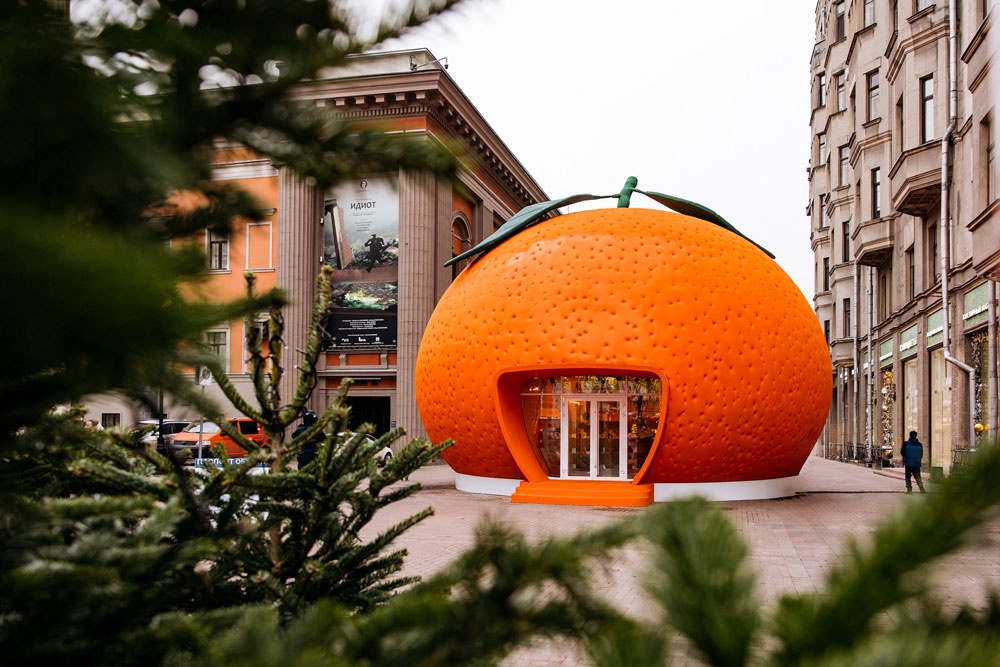 Гигантский мандарин, волшебный поезд и фабрика подарков: На улицах Москвы появились арт-павильоны