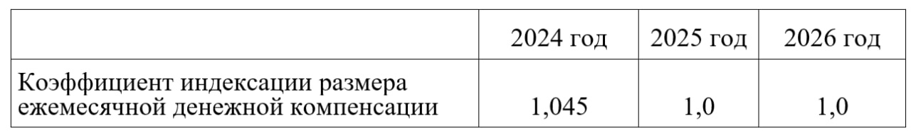 2. Установить на 2024-2026 годы следующие коэффициенты индексации размера ежемесячной денежной компенсации в возмещение вреда здоровью, предусмотренного областным законом от 06.02.2004 № 250-ОЗ "О дополнительных мерах социальной защиты инвалидов вследствие военной травмы, полученной при прохождении службы по призыву в Афганистане или на территории Северо-Кавказского региона":