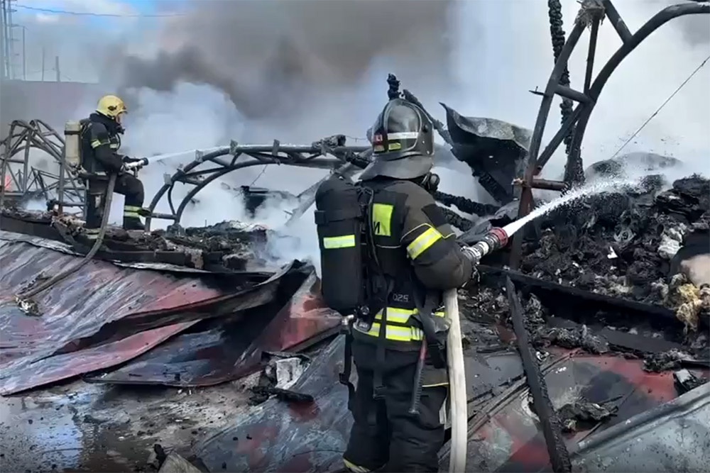 Сотрудники МЧС тушат крупный пожар на складе в Иркутске