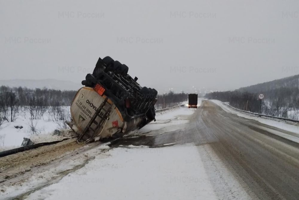 В Мурманской области на трассе опрокинулся бензовоз, вылилось 25 тонн топлива