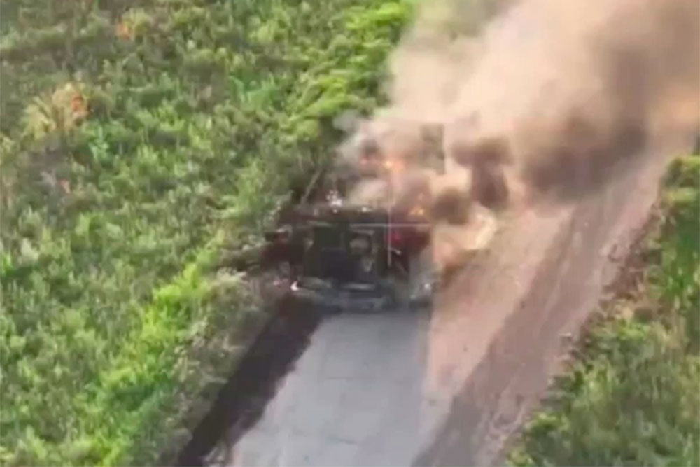 Взрыв дрона-камикадзе оторвал корму и помял левый борт канадского броневика ВСУ