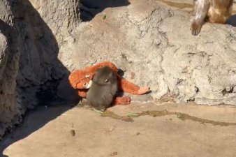 Малыш Панч прижался к плюшевому другу после нападения взрослой обезьяны