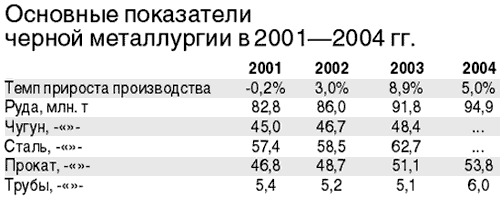 Уже в 2002 году производство стали выросло на 1,9 процента, достигнув 58,5 миллиона тонн, а проката - на 3,8 процента - до 48,7 миллиона тонн. И это несмотря на рост цен угля и кокса, увеличение железнодорожных тарифов и еще сравнительно неважную на тот период ценовую общемировую конъюнктуру.