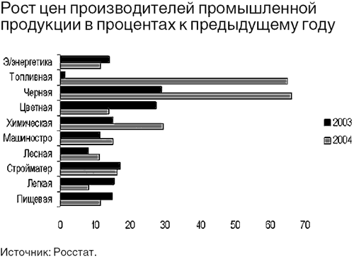 Очень любопытный пример в этом смысле - черная металлургия. Темпы прироста ее производства, прежде уступавшие разве что расширению нефтедобычи, в прошлом году, правда, немного снизились (до 5 процентов против 8,9 процента годом ранее), однако по росту стоимости экспорта (82,1 процента по результатам 11 месяцев 2004 года) этот сектор экономики уверенно опережает всех.