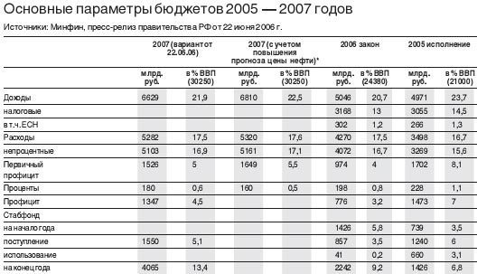 Напомним - еще пару месяцев назад правительство одобрило трехлетний финплан и основные характеристики проекта федерального бюджета на 2007 год. ВВП в нем ожидался в размере 30,25 триллиона рублей, доходы должны были составить 6,629 триллиона рублей (в 2006 году ожидается 6,02 триллиона), из которых в Стабфонд должны были пойти 1,55 триллиона рублей, расходы - 5,282 триллиона (расходы 2006 года - 4,33 триллиона), из них непроцентные, не связанные с расчетами по госдолгу - 5,103 триллиона рублей.