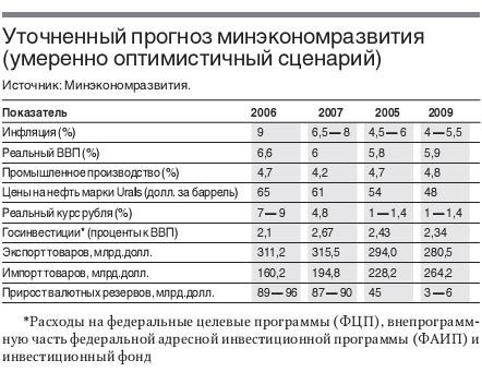 Последняя правка этих наметок связана с двумя основными обстоятельствами. Во-первых, в окончательном прогнозе минэкономразвития, обнародованном в минувшую пятницу, оценки темпов роста ВВП выросли. Пересмотреть их заставили итоги первого полугодия 2006 года: положительная динамика потребительского спроса и увеличение доходов от экспорта нефти (они, в свою очередь, пересмотрены из-за изменения прогнозных цен).