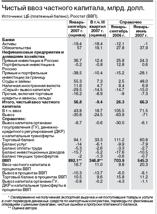 По итогам третьего квартала "утечка" капитала оказалась второй по абсолютной величине за всю историю наблюдений - 9,4 миллиарда долларов. Исторический максимум 11,8 миллиарда удержал за собой третий квартал 1998 года, на который пришелся приснопамятный дефолт. Но в сопоставлении с выросшими с тех пор масштабами экономики нынешний отток капитала выглядит вполне ординарным. Схожие показатели чистого оттока по отношению к ВВП наблюдались не далее как в начале прошлого года и в середине 2005-го.